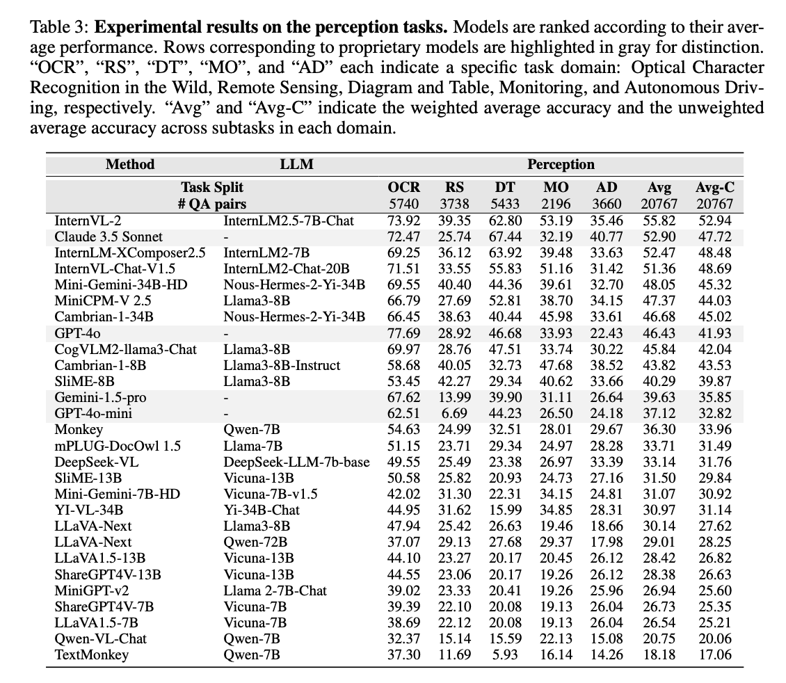 The InternVL-2 model achieved the best overall performance on both the perception and reasoning tasks, especially in the Chinese version of the benchmark. The GPT-4o model excelled in real-world OCR tasks, achieving 77% accuracy, but its performance was not as strong on other, more challenging tasks. The Claude 3.5 Sonnet model performed the best on the reasoning tasks across all the domains included in the benchmark.
